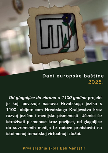 Školski projekt „Od glagoljice do ekrana u 1100 godina“ realiziran je kroz istraživačko kreativne radionice učenika te prijavljen na javni poziv Ministarstva kulture i medija Republike Hrvatske. Projekt je odobren i uvršten u službenu programsku knjižicu manifestacije Dana europske baštine 2025.